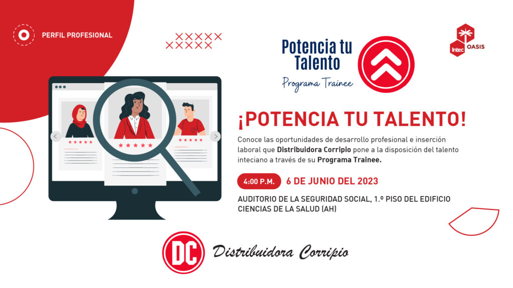 La Dirección de Servicios a Estudiantes y Distribuidora Corripio invitan a participar en el evento Potencia tu Talento este próximo 6 de junio de 2023 en el Auditorio de la Seguridad Social (OSES) del edificio AH a las 6:00PM, donde Ingrid Cruz, quien es Especialista en Reclutamiento y Selección de Personal por Competencias/Capacitación, estará […]