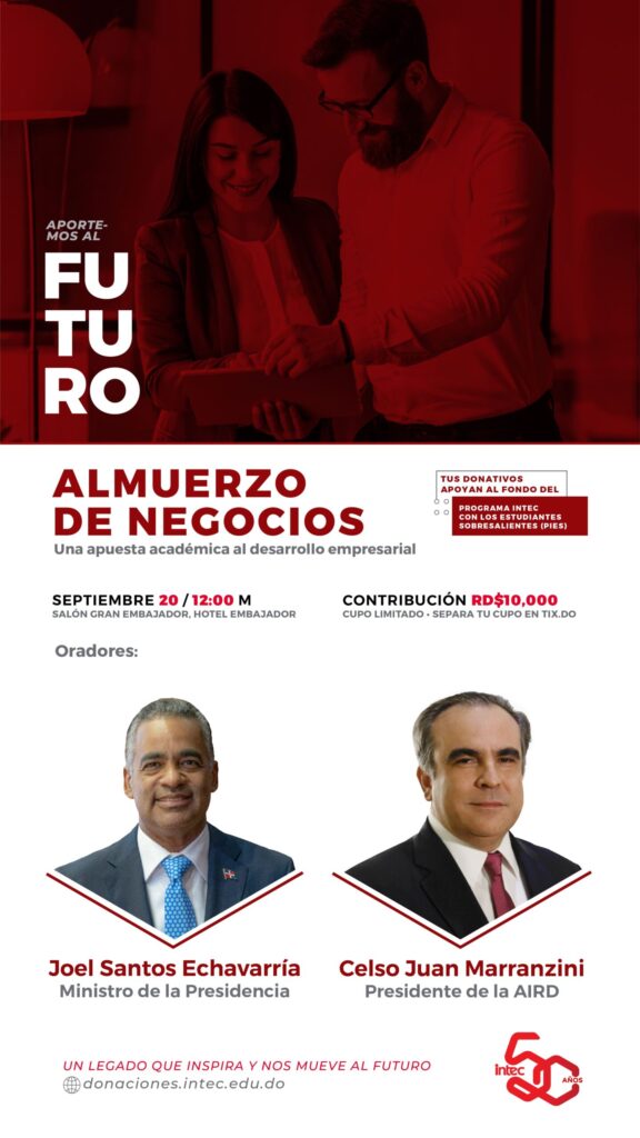 Desde el INTEC nos complace invitarles al ‘’Almuerzo de Negocio, una apuesta académica al Desarrollo Empresarial’’, con el propósito de recaudar fondos para el Programa INTEC con los Estudiantes Sobresalientes (PIES), actividad que se enmarca en la programación de celebración de nuestro cincuentenario de vida académica. Este se realizará el martes 20 de septiembre 2022 en el Hotel Embajador, […]